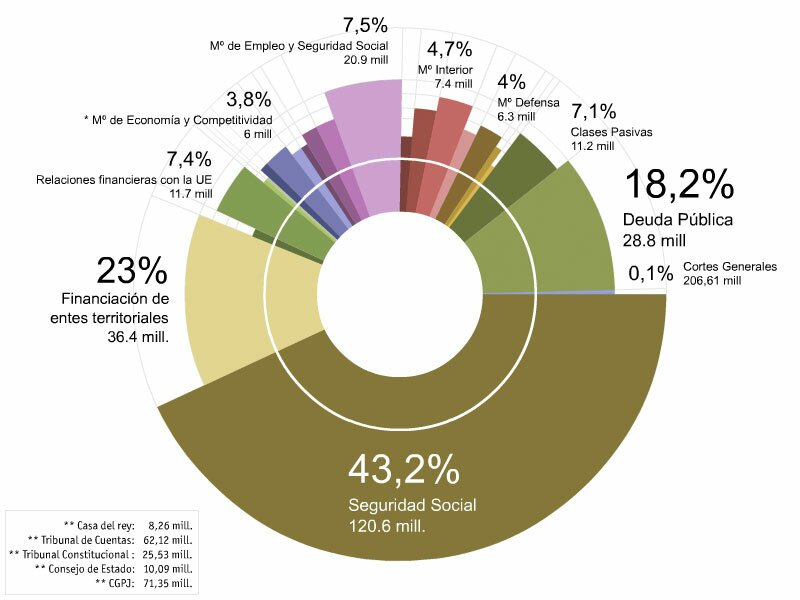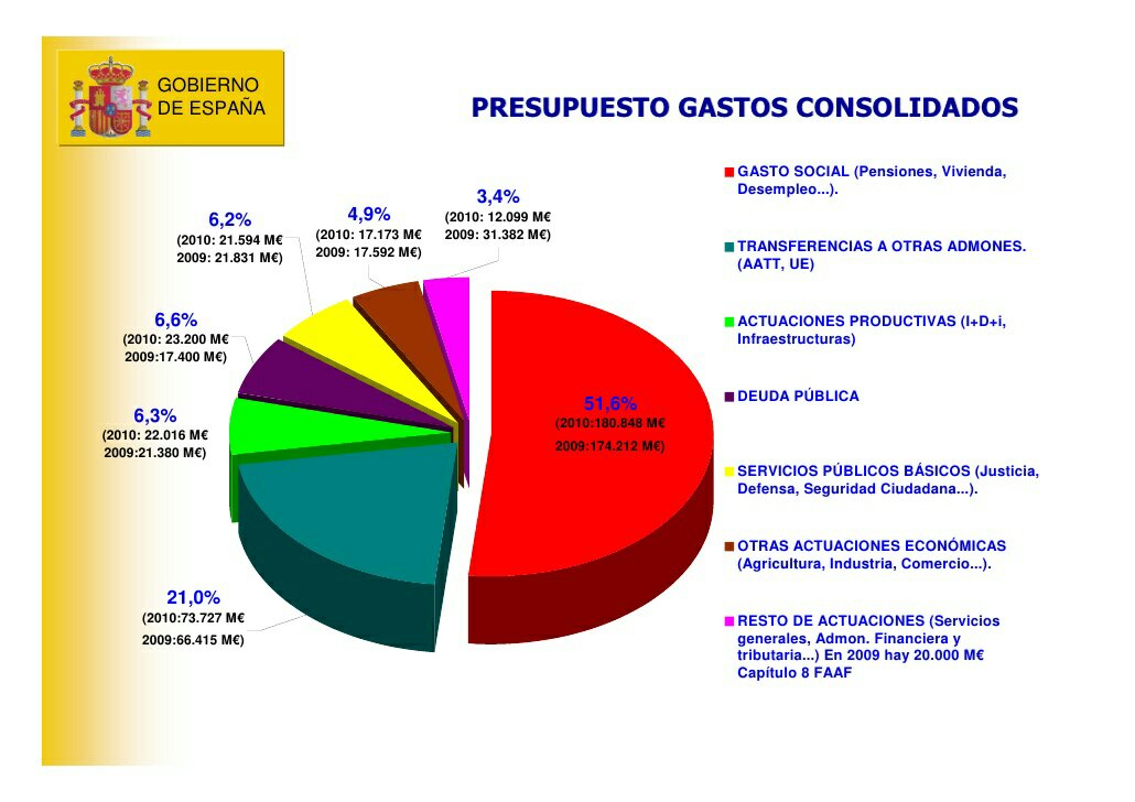 Partiendo de la premisa que usted tiene un dinero limitado , es decir su presupuesto y en caso de pasarse de gasto tendrá que endeudarse tendrá usted que elaborar una lista de gastos y cuadrarlos con sus lista de ingresos. Procedamos a ello pues y desparramemos la vista sobre los siguientes cuadro para hacernos una muy pequeña idea de como gasta España sus dineros.